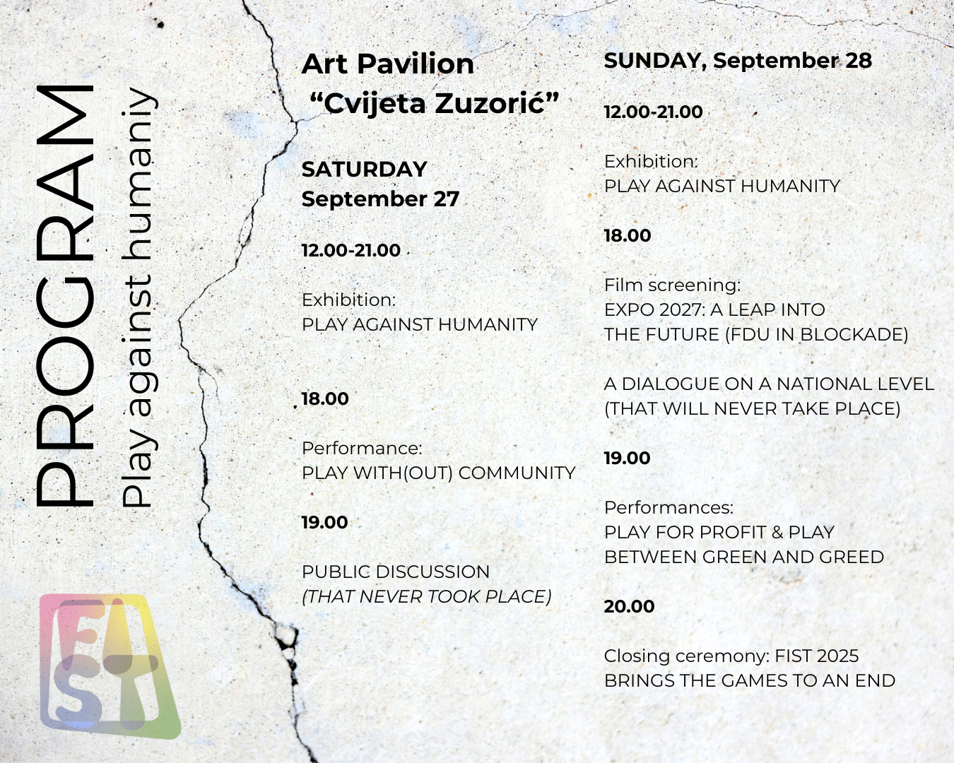 FIST 2025 adopts the format of EXPO 2027 but transforms it into a space of debate and resistance, exploring open questions of corruption, media manipulation, and environmental devastation. The EXPO slogan is “Play for Humanity” - FIST calls it “Play Against Humanity.”