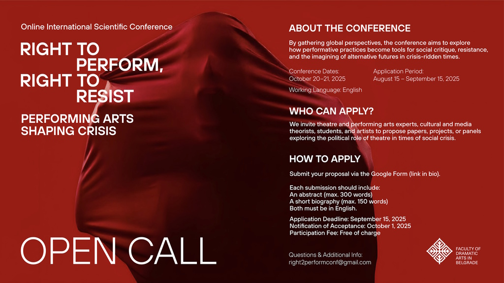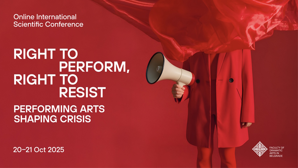 “Right to Perform, Right to Resist: Performing Arts Shaping Crisis” is an interdisciplinary scientific conference dedicated to examining the political potential of the performing arts in times of social crises. It will be held online on 20 and 21 October 2025 and will bring together experts in theatre, performance, culture, and media, as well as students and artists from Serbia and abroad.