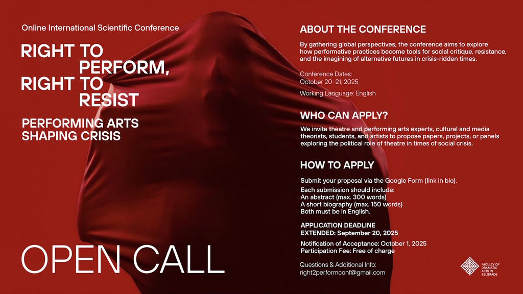 “Right to Perform, Right to Resist: Performing Arts Shaping Crisis” is an interdisciplinary scientific conference dedicated to examining the political potential of the performing arts in times of social crises. It will be held online on 20 and 21 October 2025 and will bring together experts in theatre, performance, culture, and media, as well as students and artists from Serbia and abroad.