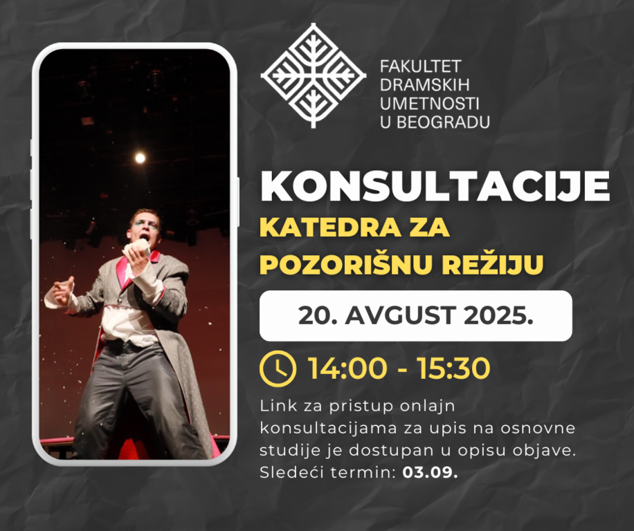 Katedra za pozorišnu režiju poziva zainteresovane kandidate i kandidatkinje da prisustvuju poslednjim terminima konsultacija za upis osnovnih studija u školskoj godini 2025/2026.