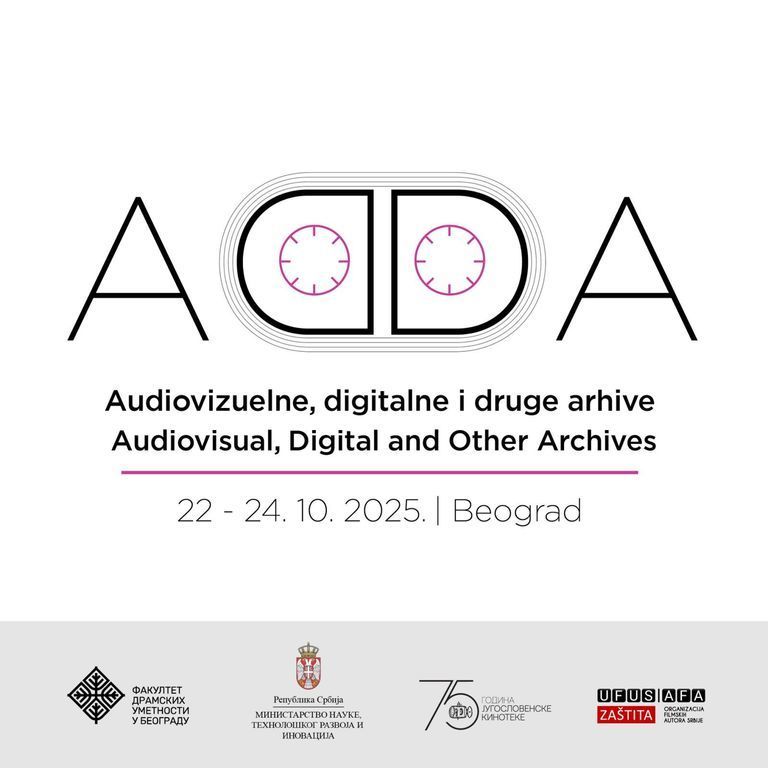са великим задовољством вас позивамо на конференцију ADDA – АУДИОВИЗУЕЛНЕ, ДИГИТАЛНЕ И ДРУГЕ АРХИВЕ коју Факултет драмских уметности организује у Југословенској кинотеци од 22. до 24. октобра 2025. године. Конференција се организује уз подршку Министарства науке, технолошког развоја и иновација и УФУС АФА заштите, Организације филмских аутора Србије.