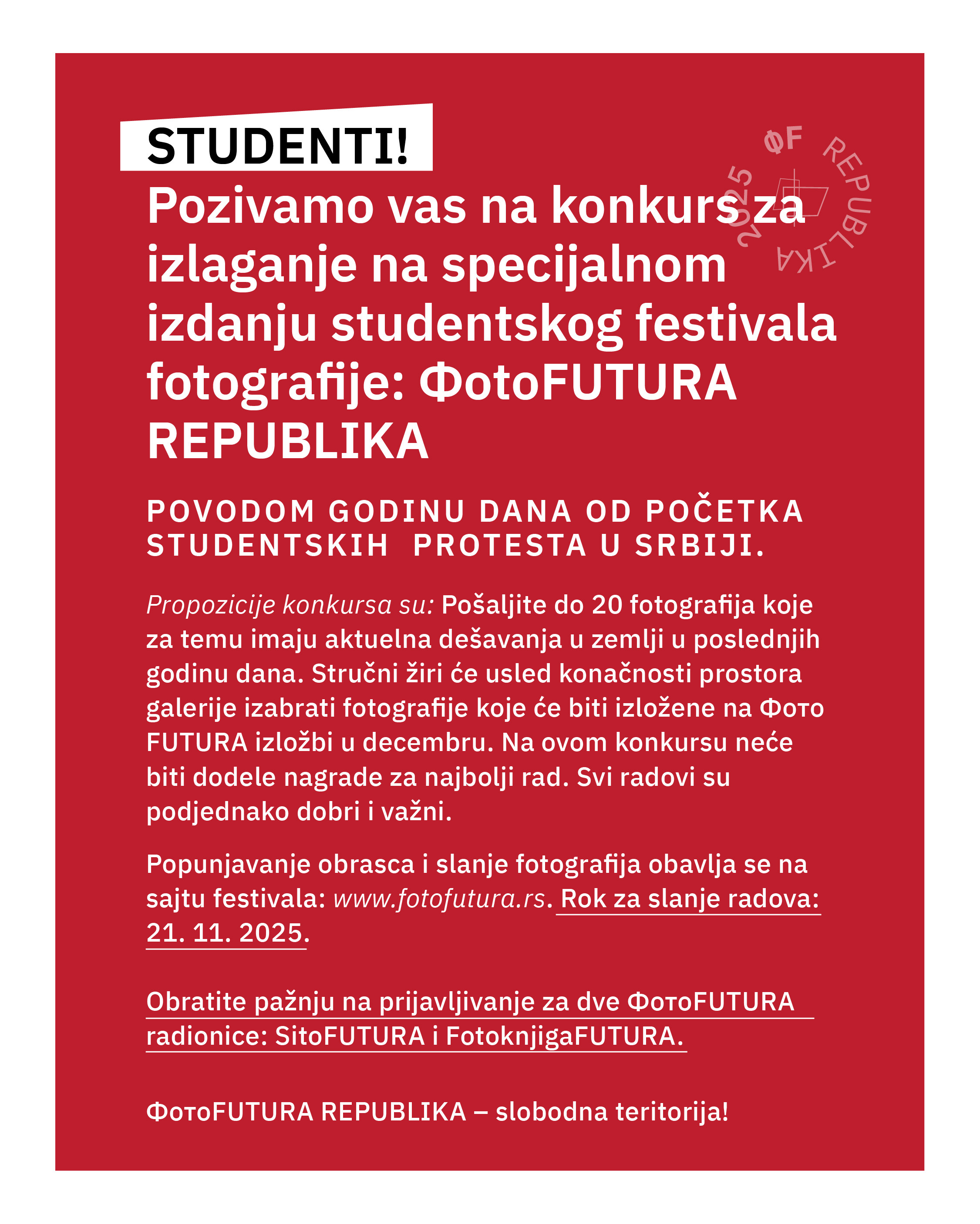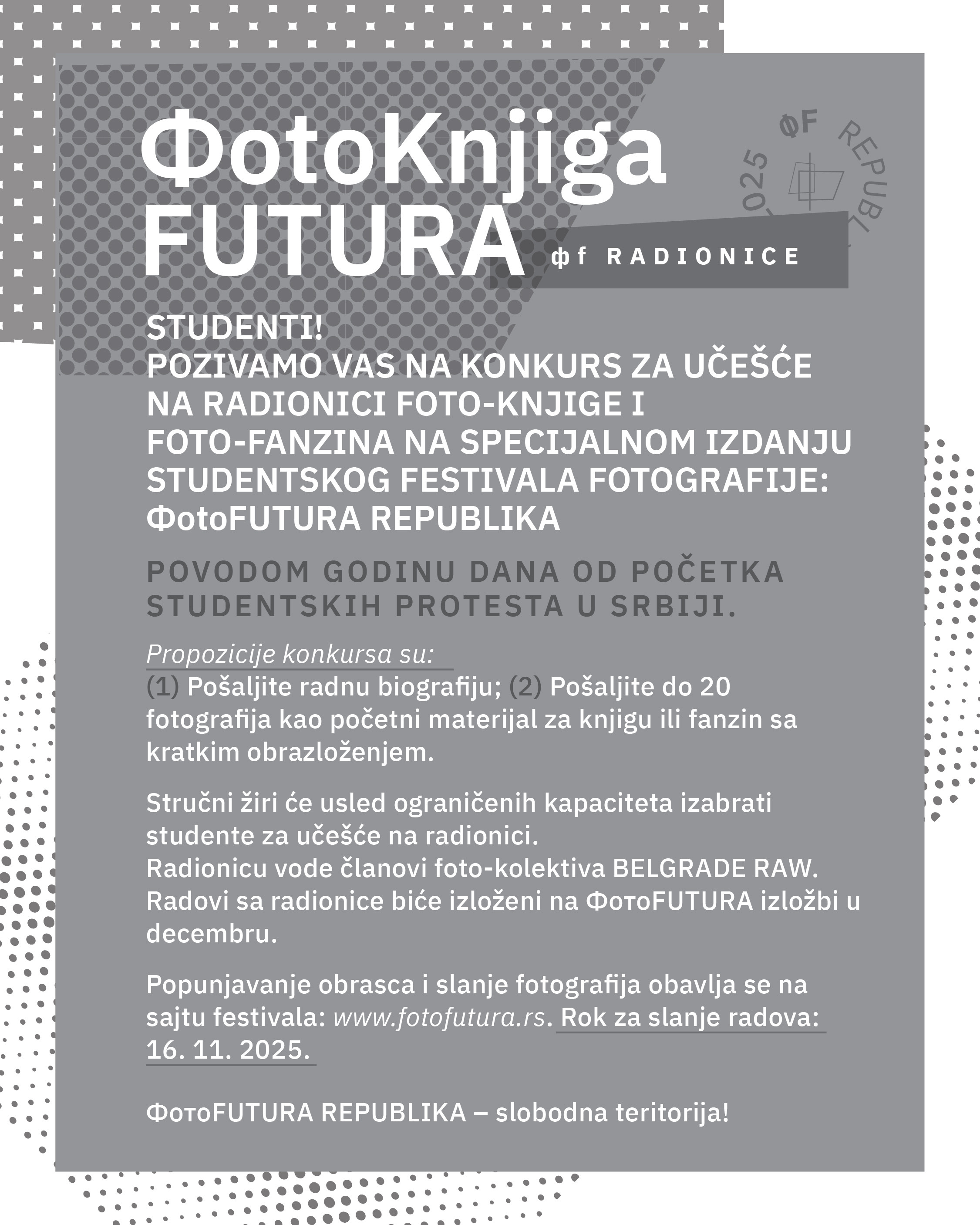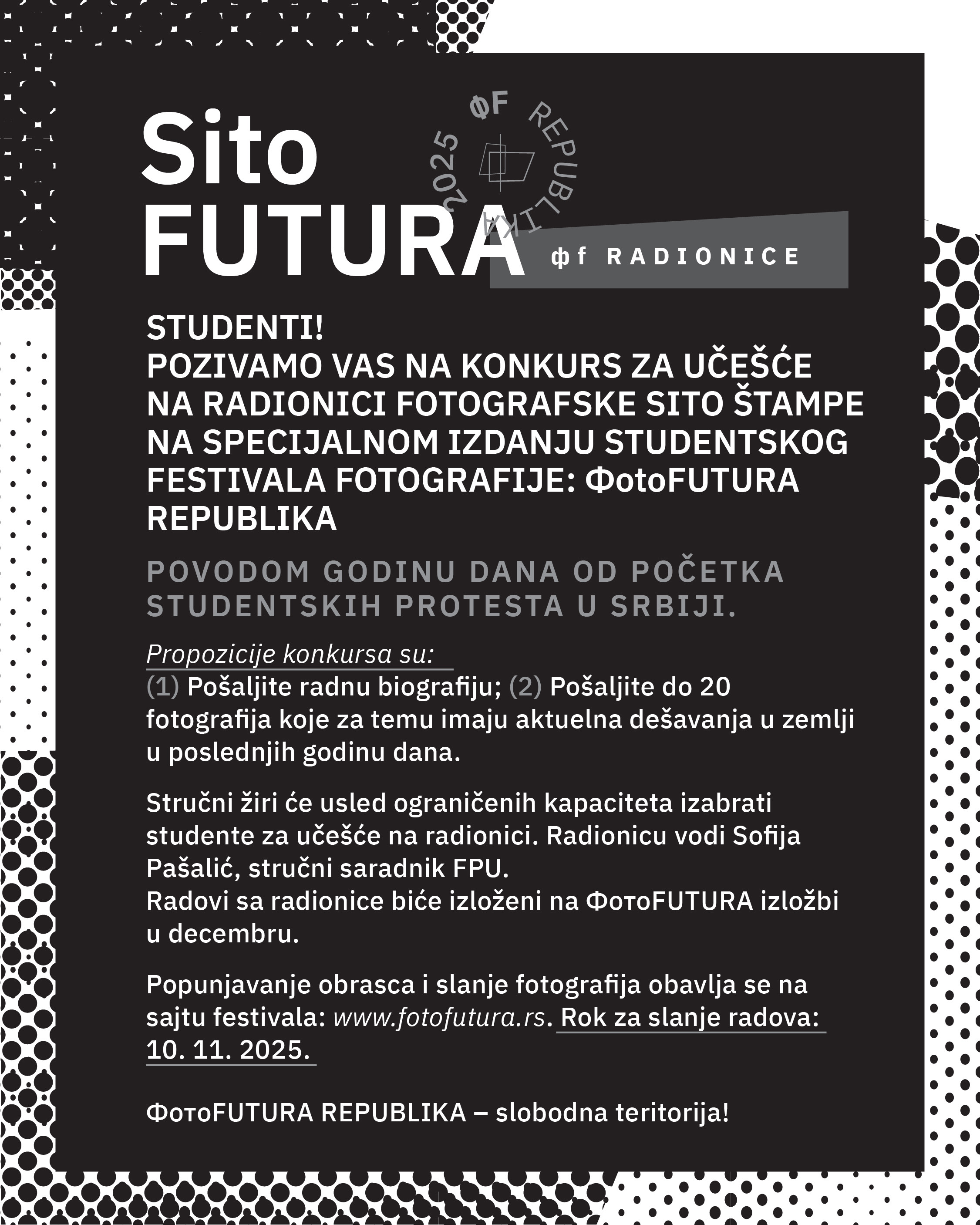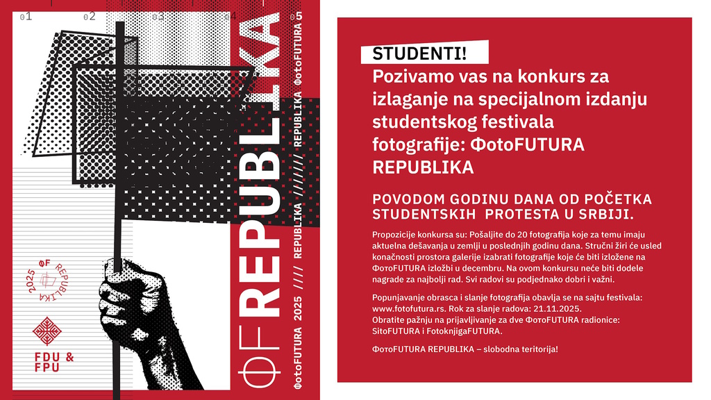 КОНКУРС ЗА ИЗЛАГАЊЕ НА СПЕЦИЈАЛНОМ ИЗДАЊУ СТУДЕНТСКОГ ФЕСТИВАЛА ФОТОГРАФИЈЕ: ФотоFUTURA04. новембар 2025. 12:31:40 Више информација можете пронаћи ОВДЕ. Слике