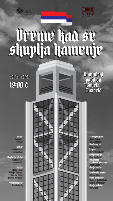 Завршни испит мастер студија Позоришне режије студента Александра Јовановића, менторка: др ум. Снежана Тришић, ванр. проф. „Време када се скупља камење“ аутора Арсенија Штимца, биће изведен 29. 12. 2025. у Павиљону „Цвијета Зузорић“ у 19 часова.
