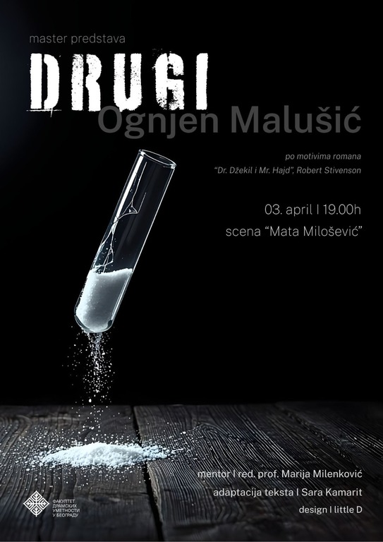 Мастер рад студента Глуме Огњена Малушића, ментор Марија Миленковић, ред. проф. „Други", по мотивима романа „Доктор Џекил и мистер Хајд" Роберта Стивенсона, биће изведен на Сцени „Мата Милошевић", 3. 4. 2026. у 19h.